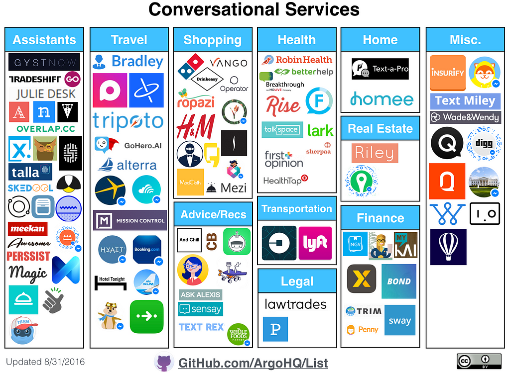 It seems like every day there's a new Assistant-for-X service, messaging-based business, or AI-powered chatbot. It can be difficult to keep up, so we wanted to put together a clean overview and maintainable list. You can access the raw data and make suggestions at GitHub.com/ArgoHQ/List.