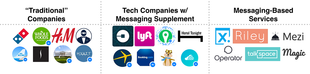 Segmenting by industry, of course, isn't the only useful way to organize these services. We also sliced them up by how they serve the company: is it a new line of business fundamentally made possible by messaging? An established and "traditional" company adding a messaging product as a supplement? Or perhaps a technology company adding a conversational layer as another way to access its product or service?